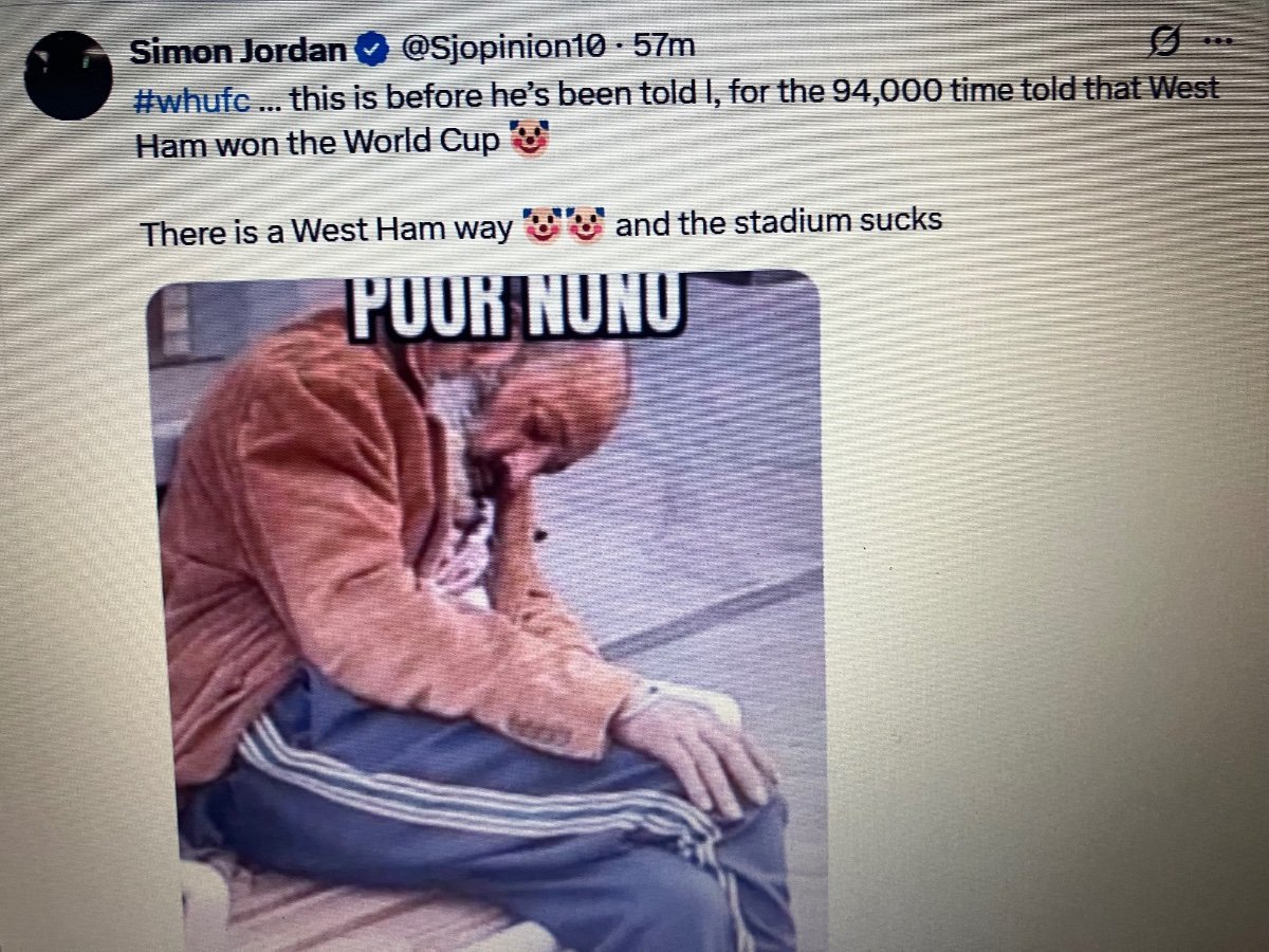 Dr. Feelgood Posted September 27, 2025 Posted September 27, 2025 19 minutes ago, W.cramp said: Nuno will be in. Will this be his 4th prem club ? Wolves,spurs,forest and potentially the irons. The new allardyce He blooming is too. Already announced. I suspect they'd already spoken with him 😂 Quote