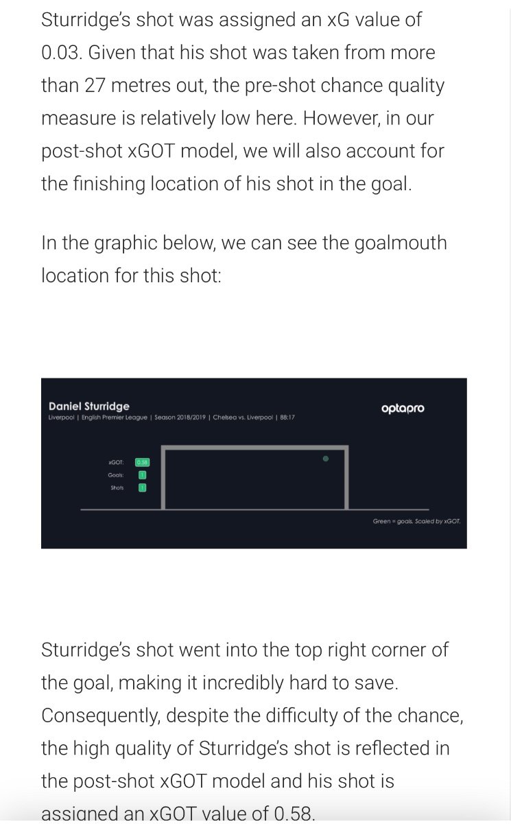 Dr. Feelgood Posted July 3, 2024 Posted July 3, 2024 9 minutes ago, Mantra said: https://www.statsperform.com/resource/introducing-expected-goals-on-target-xgot/#:~:text=xG measures the quality of,to do with these chances. just been reading up on it - quite interesting really. As I understand it: xG = pre shot. Eg if you shoot from 5 yards out you will have a higher xG than if you shoot from 25 yards out. xGOT = post shot. Eg if you shoot right down the middle of the goal you will have a lower xGOT than if you had put one right in the top corner What a pile of owd shite. Quote