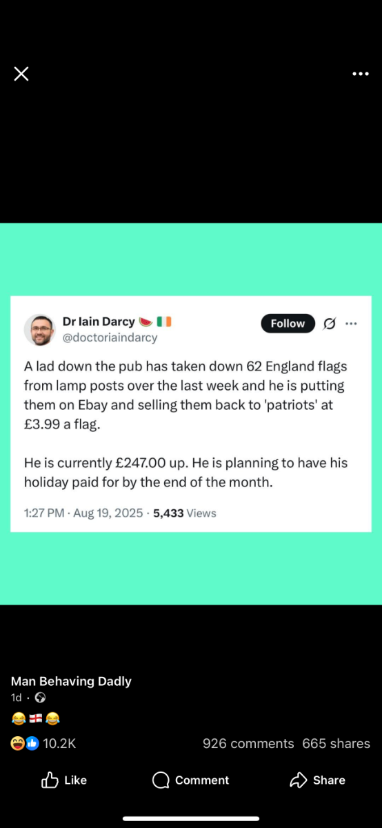 Sweep Posted August 25, 2025 Posted August 25, 2025 4 minutes ago, paulhanley said: I don't understand how anybody could have a problem with people flying the flag of the nation in which they were born. Pride in your home country is something that is so normal abroad that it goes without comment. The three countries in which I have travelled most are the USA, Turkey and France. In each of those countries you are never a few steps away from seeing the national flag on show somewhere. The flags of which you speak, are they usually proper flags, or daubings on bedsheets, that look a bit naff, of ones that have slogans written on them? As I said yesterday, I drove through Milton Keynes, and it looked absolutely shit, crap flags, bedsheets, poorly painted roundabouts. I also drove through a Cambridgeshire village, and it looked great. My problem isn't the flag shagging, that's fine, it's the scruffy attempts, that lets be honest, look absolutely terrible. It's almost as though the shitter the flag, the more of a patriot people think they are Quote