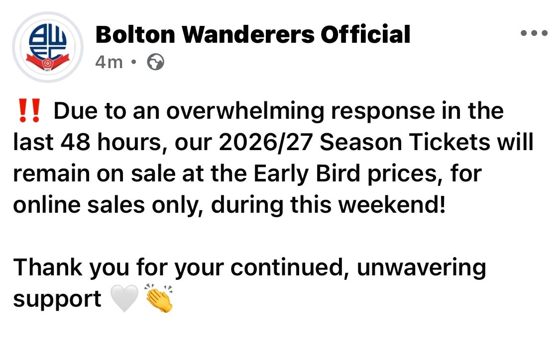 Cheese Posted February 27 Posted February 27 https://www.bwfc.co.uk/news/early-bird-prices-continue-over-weekend So far, your incredible support has resulted in over 14,000 supporters securing their season ticket already for the 2026/27 campaign. Quote