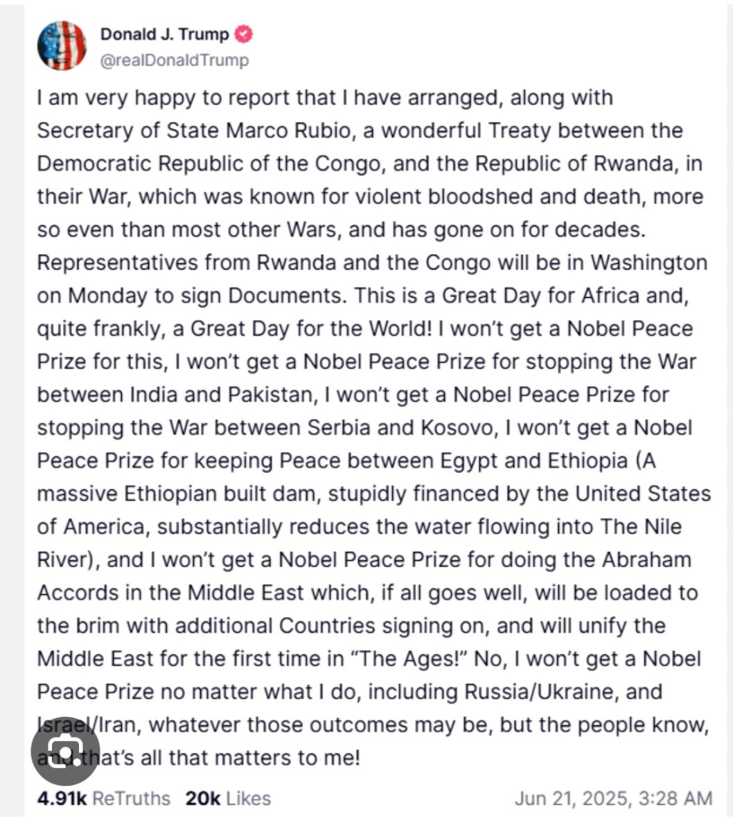Winchester White Posted June 21, 2025 Posted June 21, 2025 You think he might want the Nobel Peace Prize? 🤣 It's only because Obama got one (dubiously) that he's so obsessed. Quote