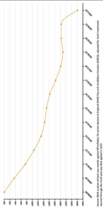 kent_white Posted March 12, 2023 Posted March 12, 2023 2 minutes ago, kent_white said: Just changing the subject slightly. My mate is a junior doctor and has just posted this. Their pay since 2009 adjusted for inflation. He also posted this....... "Friends, many of you will be concerned by the BBC News article about greedy work-shy doctors demanding unreasonable pay rises this week. Yes, it's true that the median junior doctor (anyone who isn't a consultant or specialist, which ranges from graduation through to 10+ years after qualifying) is higher than the median pay in this country. After the debt of 6+ years at university, plus countless professional exams (which we pay for ourselves), and yearly fees to the GMC, indemnity, and Royal Colleges (which we pay for ourselves) while working 48h a week, including nights and 1:3 weekends making lifesaving decisions, this doesn't seem unreasonable to me. And yes, it's also true that we get pay rises as we progress in seniority. This again seems fair - as you shoulder more of the burden of responsibility and decision making, you should get paid more for that. The manager of a shop gets paid more than the till staff because the buck stops with them. But this isn't about any of that. This industrial action is calling for *pay restoration*. We don't want more money for doing our job, just want to be back on a par with where juniors were before inflation started outstripping pay rises back in 2008. Ask yourself whether a junior doctor today, be they a first year FY1 or a final year ST8 trainee, is seriously worth 26% less than the same doctor in 2008? We're working harder, with more hoops to jump through and higher costs associated with training, but being paid only 3/4 of what our colleagues were 15 years ago. And that, in my mind at least, isn't fair. Nor is it how we keep the best and brightest doctors in this country, caring for you, when they could easily go abroad and get paid twice as much to work less in Australia or America. So this is ultimately a question of how our Government values junior doctors, and by extension how they value your health. Are the people trying to perform your surgery, run your clinics, report your scans, or fix your broken bones while struggling in a grossly (some may say deliberately?) under-resourced system really only worth 3/4 of what they once were? I hope you'll see through the propaganda coming from the Government, and support us this week. It really isn't an easy decision, walking away from our patients, but we're doing it to safeguard your NHS going forward." Quote