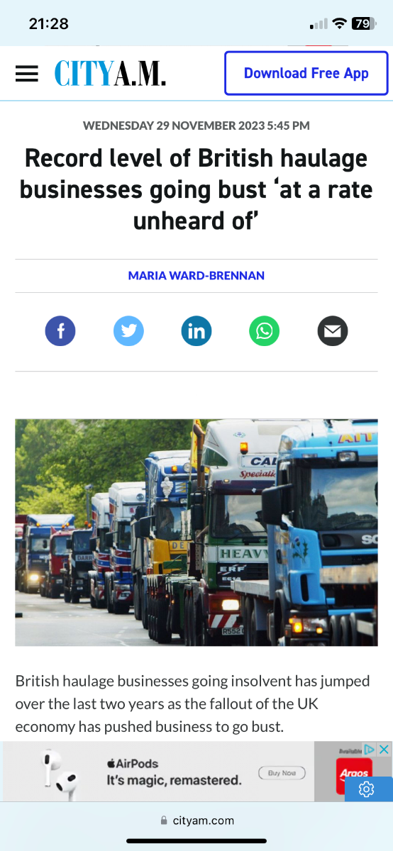 Spider Posted December 5, 2023 Posted December 5, 2023 8 minutes ago, Tonge moor green jacket said: It's gone quiet on that front recently- presumably the numbers are increasing slowly. The haulage industry all over isn't having an easy time at the moment. The same cost issues affecting plenty. A quick search and I found an example immediately. It only happens here though, just as football only started at the advent of the Premier league. Inflation, fuel costs, new vehicle costs etc etc, only affect this country it seems. It’s a shame we can’t control our own destiny Quote