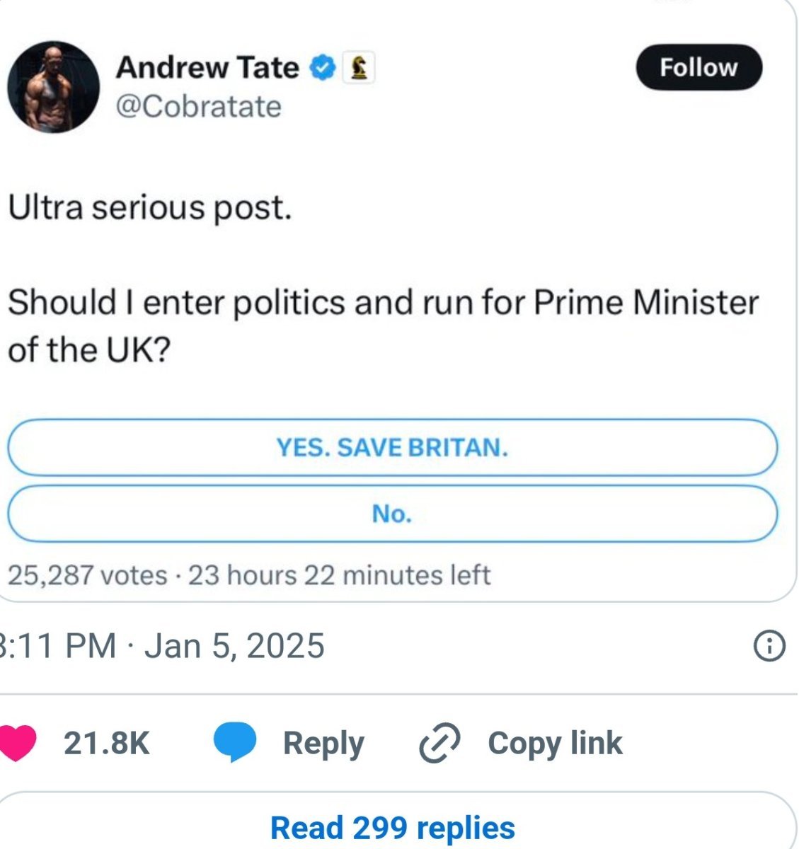 mickbrown Posted January 7, 2025 Posted January 7, 2025 This dick thinks we're like America. You don't run for Prime Minister Quote