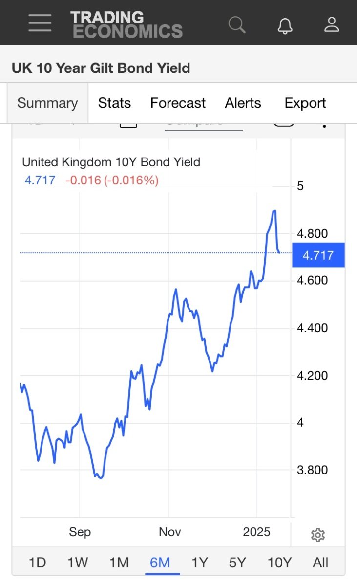 Guest Posted January 16, 2025 Posted January 16, 2025 8 minutes ago, BobyBrno said: 😅 Yesterday you said they don’t really matter. It’s one day. Here is the graph since the budget. They could go up tomorrow 🤷♂️ I never said they don’t matter. But what happens with them is only very very marginally to do with the budget or Reeves. There is little anyone can do about them. Their impact is the issue as I outlined yesterday and the day before. Nothing has changed in the U.K. economy in the last year - and that’s a problem. A big problem for Reeves. But that’s very different to the ‘oh gilts are spiking reeves has to do something’ narrative which was always total nonsense. Quote