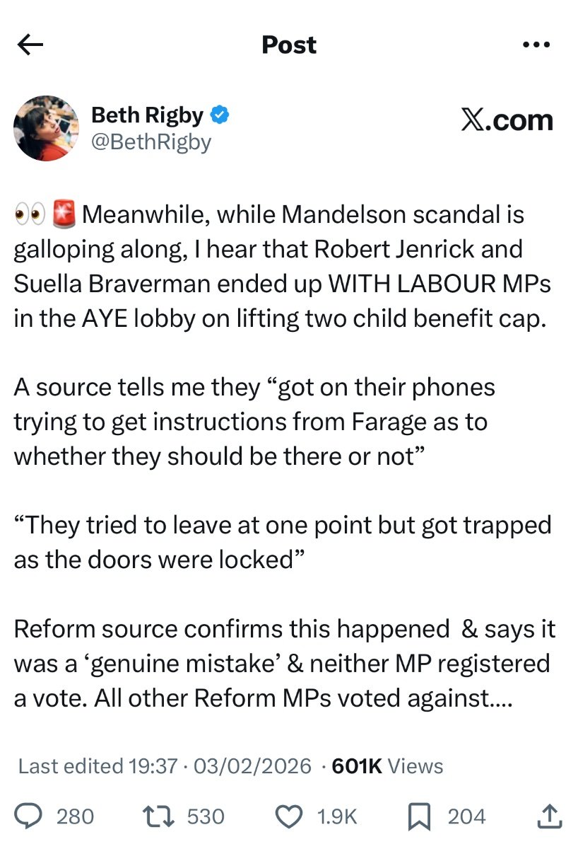 Tonge moor green jacket Posted February 4 Posted February 4 9 hours ago, Spider said: Meanwhile, over in the next party to lead the country, they can’t even organise 8 MPs at voting time. Imagine what’ll happen when they have 300 to wrangle. I can’t wait for it to begin: Reform's policy is also to remove the 2 child benefit cap, but with some caveats- it won't apply to everyone. I've not followed this debate, and the exact nature of the legislation, but it seems communication wasn't the best! Quote