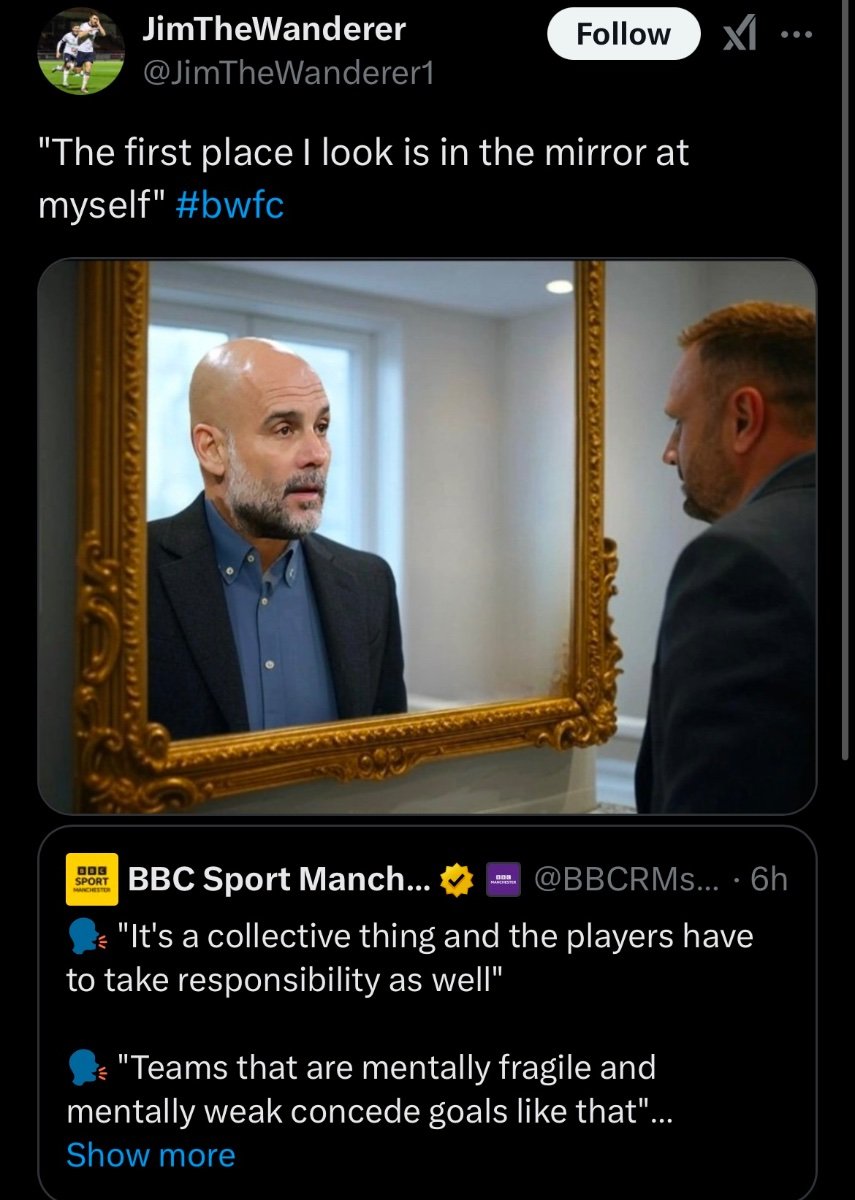 boltonboris Posted January 6, 2025 Posted January 6, 2025 On topic, but off-topic. Those All or nothing documentaries really appeal to me. I love them. One thing I remember is the Arizona Cardinals having a real go for the Superb Owl a while back. They had a good team, of youth and experience and recruited well out of the Draft. They had a QB who was getting on a bit, but was having one of his best ever seasons. He broke his throwing hand and thumb in a collision with some guys helmet I think, but luckily they had a bye-week (where they miss a game due to the way the fixtures fall), so he had really intensive physio after a small surgery as they were desperate to get him back in ASAP. They had a backup QB, but he wasn't really at the same level (Baxter / Coleman vibes) - They rushed the starting QB back, but his production was down and they succumbed to a pretty lacklustre play-off defeat. Anyhow, nobody blamed the back-up QB for not being good enough to step up and be an equal and get the team through. The GM and the owner (the people responsible for the budget and the transfers) all apologised and took responsibility for not building a resolute enough roster (squad) to cope and get them over the line That's the kind of accountability high performing teams demand. It's the opposite of what you see and hear form BWFC. Too many excuses to excuse poor performance Quote