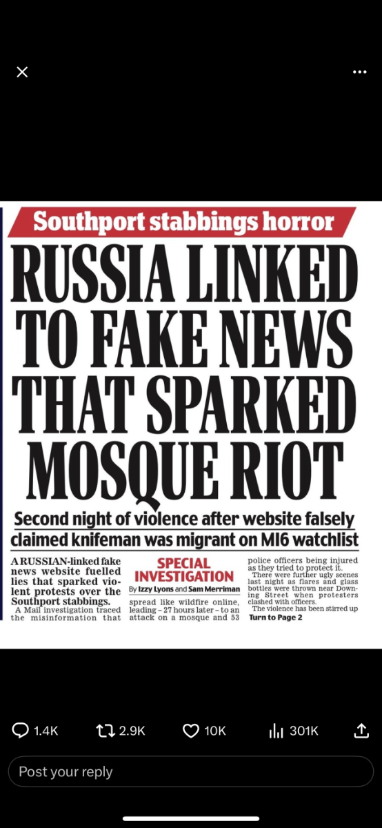 Guest Posted August 1, 2024 Posted August 1, 2024 As a few journalists have suspected it seems Russia is stoking up these ‘riots’. Putin’s play to destabilise us. Hopefully the people of Southport rebuilding that wall as one community have shown why it will fail. https://www.thesun.co.uk/news/29612676/pro-putin-trolls-southport-fake-news-riots-suspect/ Quote