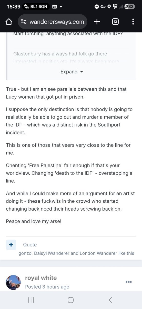royal white Posted June 29, 2025 Author Posted June 29, 2025 Just now, kent_white said: I think your brain is wired up wrong Still - you worry about the 'hurty words' and I'll worry about the borderline genocide. And I bet you had no idea who this person was before today. And now you do. So you've fallen right into their little trap. If you want to articulate why I'm wrong - I'm more than happy for you to set me straight. I won't be able to reply to you for a couple of hours mind. Just remember that there will probably be at least another couple of dead Palestinian children by that point too. So make sure you make it convincing! 👍 First of all this is the “meanwhile in England thread” there was no better place to post my original comment. Second point everyone knows what’s happening in Palestine, it’s horrendous, but we all know these things happen when there’s a war on. We can go back to my previous points about other conflicts going on now. Other groups seem to be ok with kids being murdered in other country’s but not in Palestine? If you think 1000s of people chanting “death to the IDF” at a festival that prides itself on peace is normal then so be it. The majority don’t I bet you’ve posted more today about Glastonbury then you have “border line Genocide” so how are you actually worrying about it? Quote