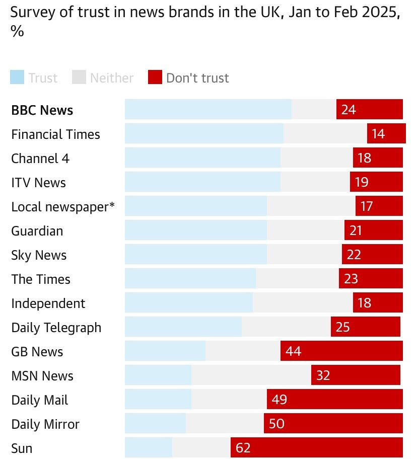 Ani Posted November 11, 2025 Posted November 11, 2025 (edited) 11 hours ago, kent_white said: The knives certainly seem to be out for the beeb! Let’s be clear though the Whistleblower they refer to is a Mr Cohen who may have a side in the whole Gaza situation, but they have chosen not to highlight that which is exactly what they accuse the Beeb of. It is interesting that to show how bias BBC Arabic is he compares with the coverage of the larger BBC News which is what the rest of us see 99% of the time. Of course there will be instances where people can show specific stories display bias and it is pretty clear that BBC Arabic has got this wrong but the idea that this displays an inherent left wing bias across the organisation is nonsense. Emily Maitlis resigned because of pressure to keep the then Tory Govt on side. Farage appears on Question Time more often than anyone else. The idea that it is full of and controlled by ‘lefties’ is just not true. Sir Robbie Gibb is not even one of the Bee Gees https://en.wikipedia.org/wiki/Robbie_Gibb What is clear that when the BBC fucks up this is reported by amongst others the BBC, enter the story of BBC errors of your choice in Google and see if the BBC has reported it. Over recent years the emergence of new news channels has rightly challenged the dominance of the established media but the idea ‘MSM’ is dead is simply not true. It is almost as though people who have propped up GB News by over £70m between 2021-2024 are doing so for a reason. Can anyone explain that in an unbiased way ? Edited November 11, 2025 by Ani Quote